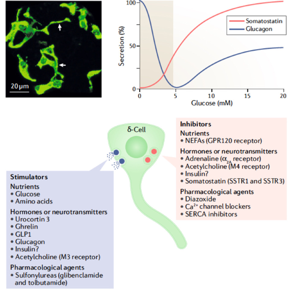 Rorsman P, Huising MO. 2018. The somatostatin-secreting pancreatic δ-cell in health and disease.